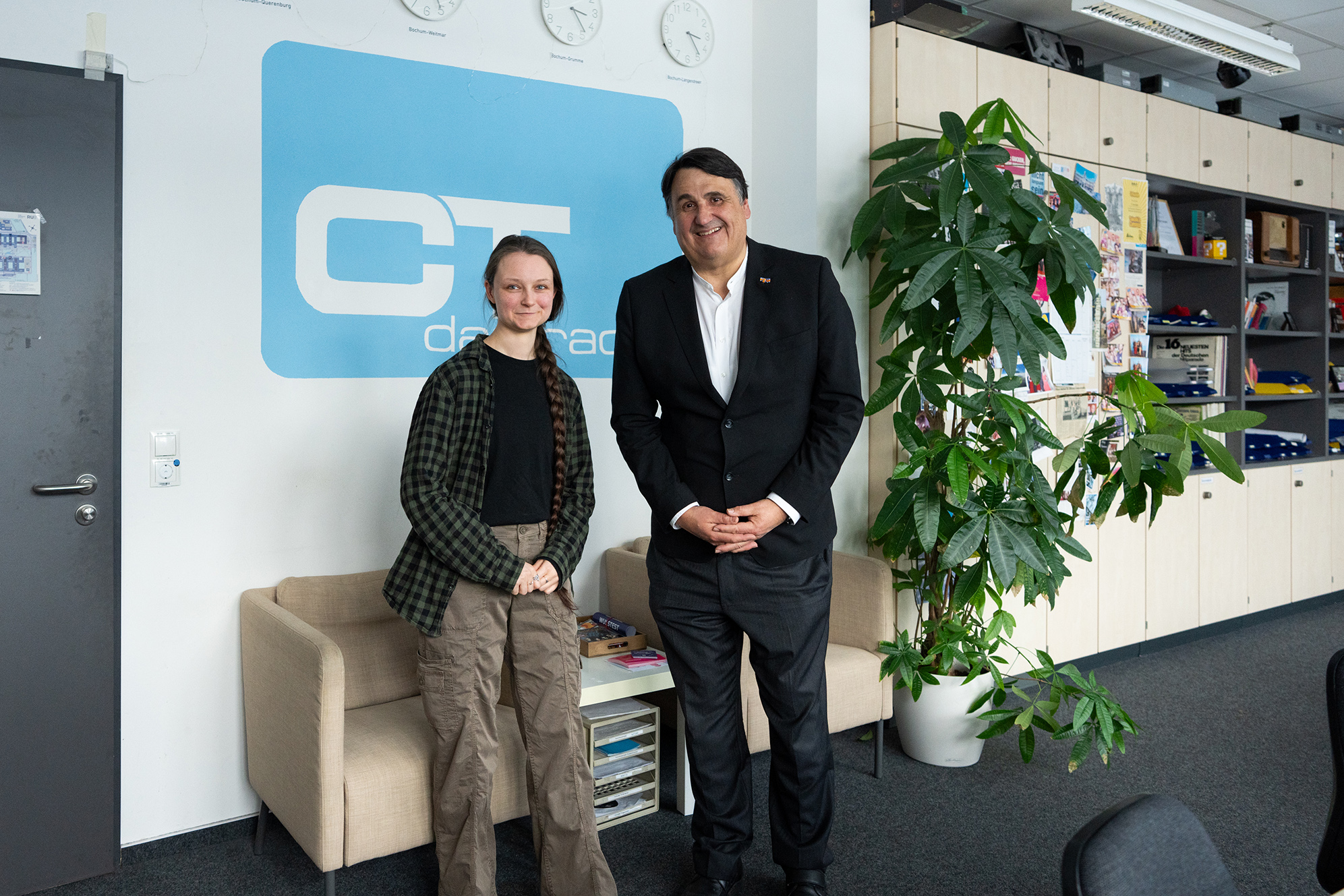 Claas Hardt und Karina Kaidarova bekommen in einer studentischen Forschungsgruppe die Chance, gemeinsam die Mikrostruktur von Metallpulvern aus Hochleistungswerkstoffen zu untersuchen.