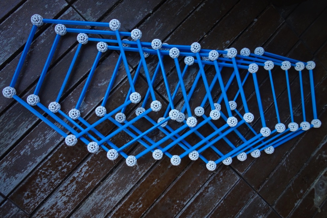 Build 12 blue pentagons and connect them with the loose r1 struts constructed in step 6. This completes the construction of the third layer of 12 dodecahedral cells surrounding the central cell.