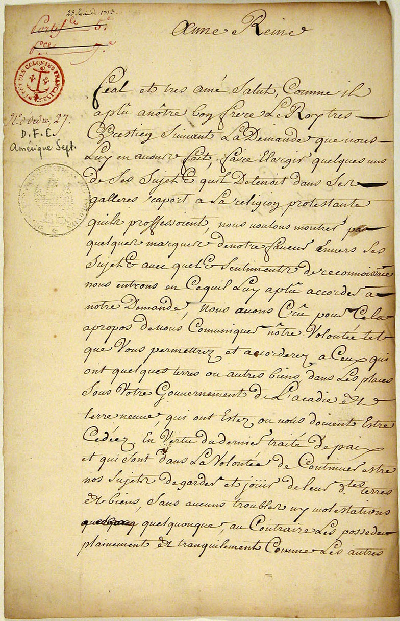 Edict from Queen Anne of England granting to the inhabitants of Acadia the right to avail themselves of their lands and possessions, June 23, 1713.