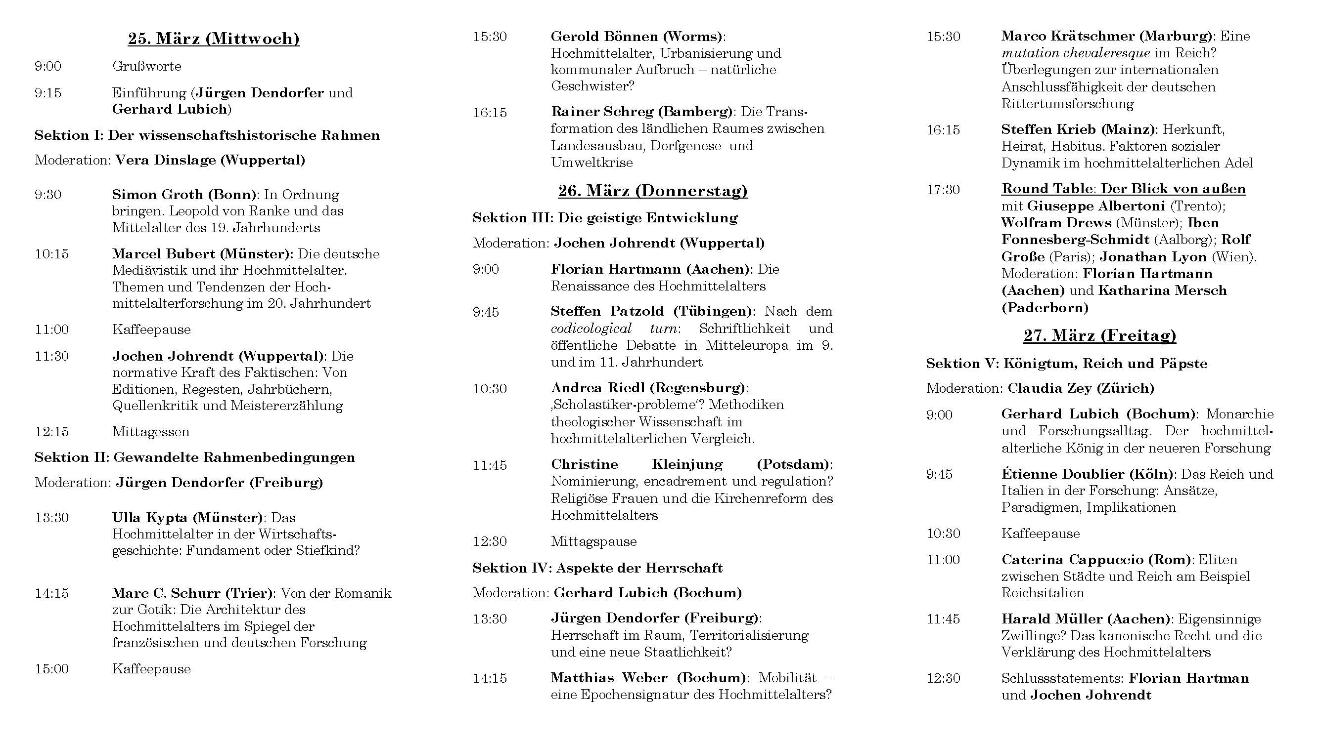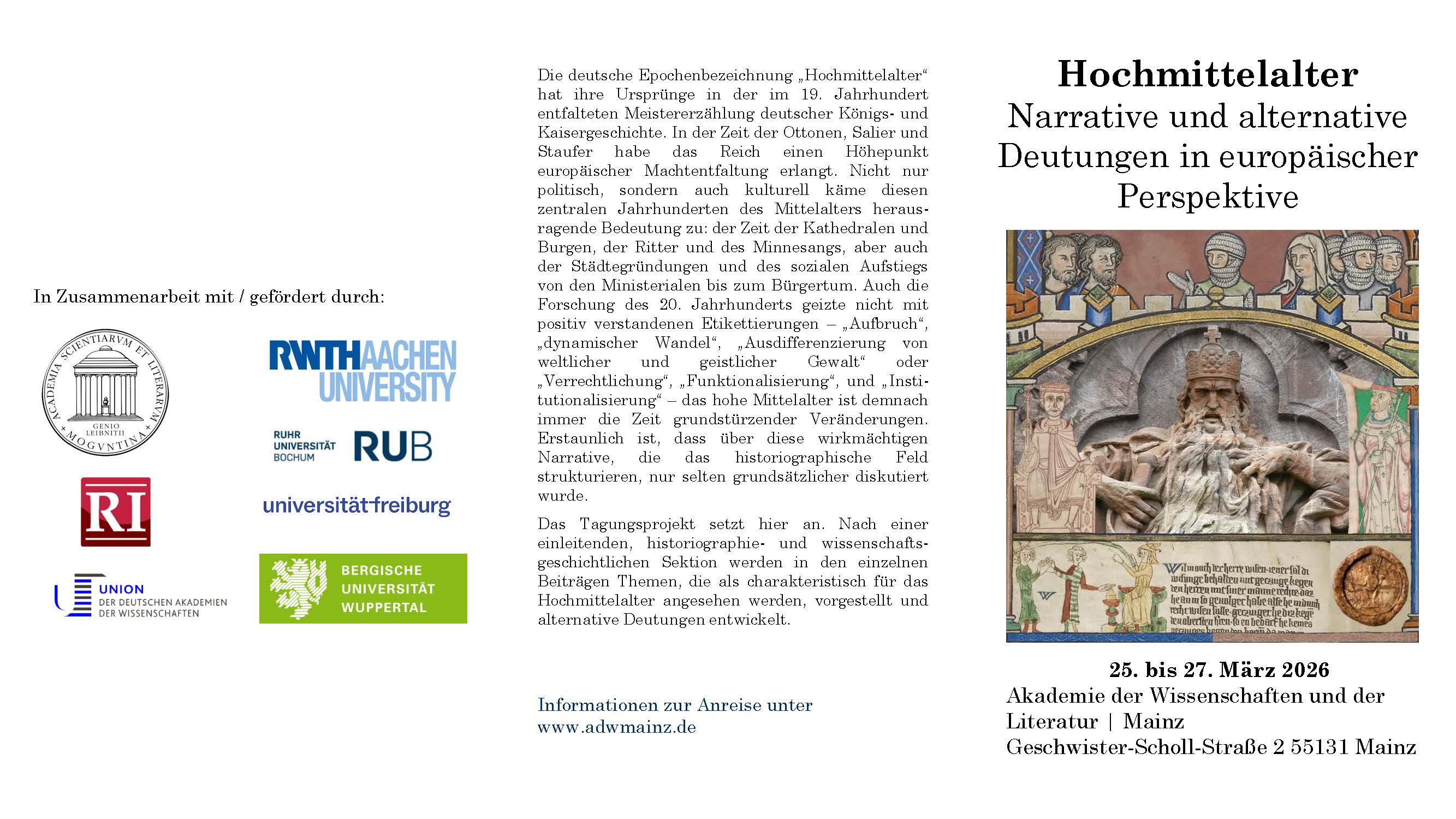 Vom 25. bis zum 27. März diesen Jahres findet in Mainz die Tagung "Hochmittelalter. Narrative und alternative Deutungen in europäischer Perspektive" statt. Das Bochumer Früh- und Hochmittelalter beteiligt sich ebenfalls. Alle Interessierten sind herzlich dazu eingeladen teilzunehmen!