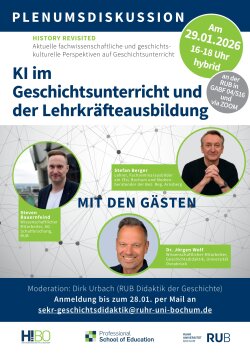 Am 29.01.2026 findet im Rahmen der Reihe "History Revisited - Aktuelle fachwissenschaftliche und geschichtskulturelle Perspektiven auf Geschichtsunterricht" die Plenumsdiskussion zum Thema „KI im Geschichtsunterricht und der Lehrkräfteausbildung" statt. Auch in diesem Jahr bieten wir die Veranstaltung in hybrider Form (als vor Ort in GABF 04/516 oder online via Zoom) an.