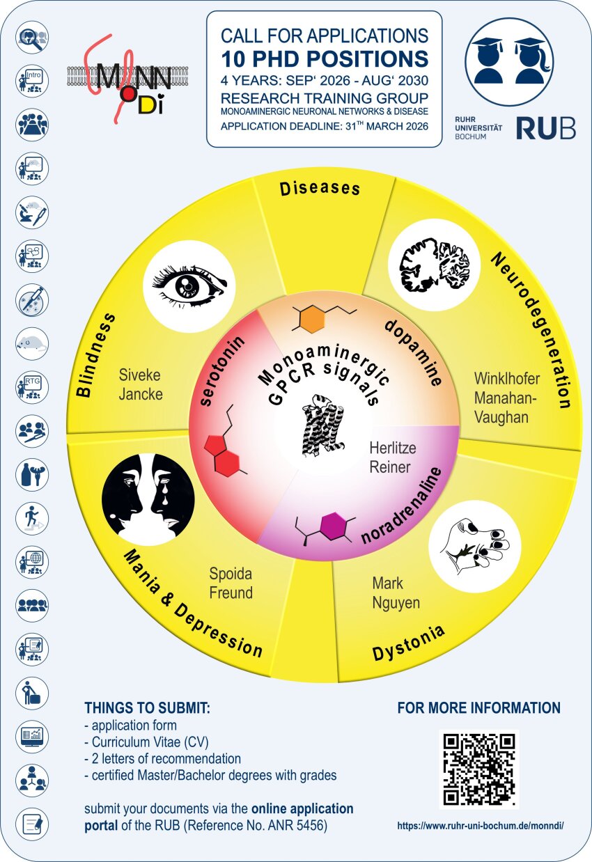 The Research Training Group Monoaminergic Neuronal Networks & Disease (MoNN&Di) at the Ruhr-University Bochum is inviting applications for 10 PhD positions, starting in September 2026.