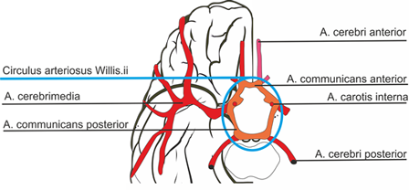 Die Blutversorgung des Gehirns erfolgt über vier Arterien (Blutgefäße, die Blut vom Herz wegführen), die jeweils paarweise rechts und links in das Gehirn führen. Dies sind die Arteria vertebralis und die Arteria carotis interna, beide führen jeweils rechts und links vom Rumpf in den Kopf und versorgen das Gehirn mit Blut. Die grafische Darstellung der Lage dieser Arterien finden Sie weiter unten in Abbildung 13. Alle vier Arterien finden an der Schädelbasis zunächst zu einem kreisverkehrartigen Ring (Circulus arteriosus Willisii, siehe Abb. 14) zusammen und verzweigen sich davon ausgehend immer wieder, bis auch das ‚hinterste Ende‘ des Gehirns versorgt wird. Ein Oberarzt einer auf Schlaganfälle spezialisierten Klinikabteilung (engl. Stroke Unit) in Duisburg hat dieses System einmal mit einem Baum verglichen. Ein recht treffender Vergleich, denn wenn man sich vorstellt, dass in einem Baum der Zufluss für die Nahrung verstopft ist, so ist es wichtig, zu wissen wo. Je weiter oben in der Baumkrone der Nahrungszufluss stoppt, desto enger begrenzt ist der Bereich, der nicht mehr versorgt werden kann und wo dann – um im Bild zu bleiben – die Blätter absterben. Ein Schlaganfall ist nichts anderes als die Unterbrechung des Blutflusses einer bestimmten Region, ob nun aufgrund einer Verstopfung (einer Ischämie) oder aufgrund einer geplatzten Arterie (einer Hirnblutung).