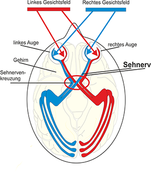 Die Ursache für eine Gesichtsfeldbeeinträchtigung ist eine Läsion im Verlauf der Sehbahn im Gehirn, die Augen an sich sind nicht betroffen. In der Abbildung 1 kann man den Verlauf der Sehbahnen im Gehirn erkennen. Vereinfacht gesagt verlaufen die Sehnerven von den Augen über die Sehnervenkreuzung zum hinteren Teil des Gehirns, dem visuellen Kortex, der die Sehrinde beinhaltet (siehe auch Ratgeberteil Gehirn – Aufbau und Funktion). Hierbei gibt es eine Besonderheit, die wichtig für das Verständnis der Gesichtsfeldausfälle ist. Die Informationen aus dem rechten Gesichtsfeld gelangen, wie in Abbildung 1 (für eine vergrößerte Darstellung bitte auf die Abbildung klicken) gut zu erkennen, auf die linke Seite des visuellen Kortex und umgekehrt.